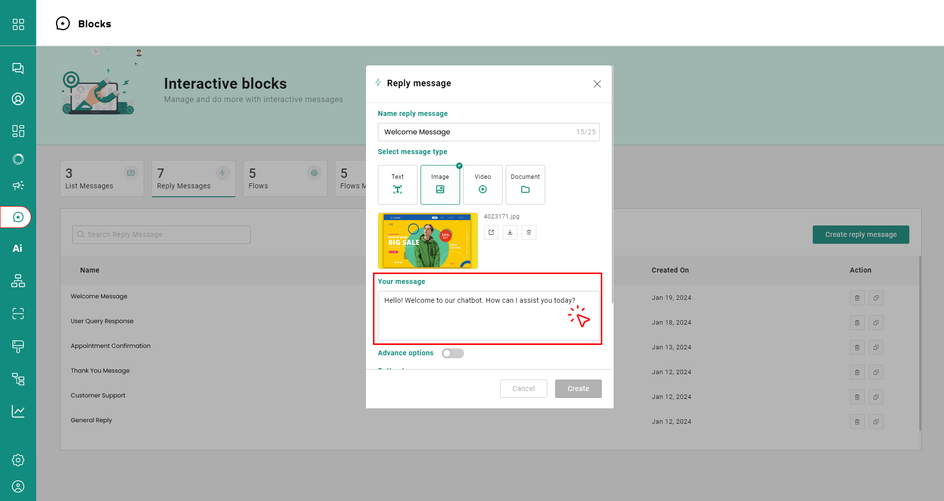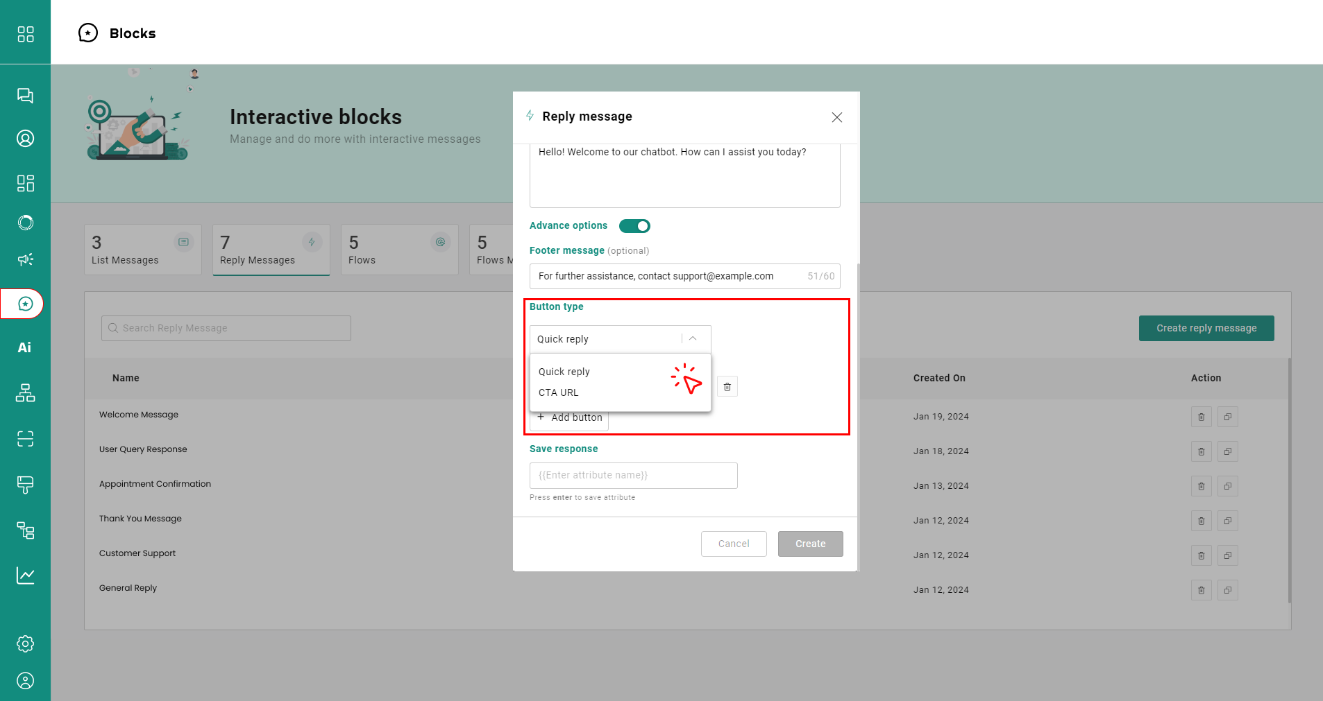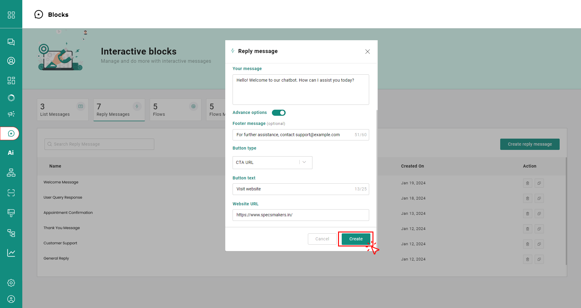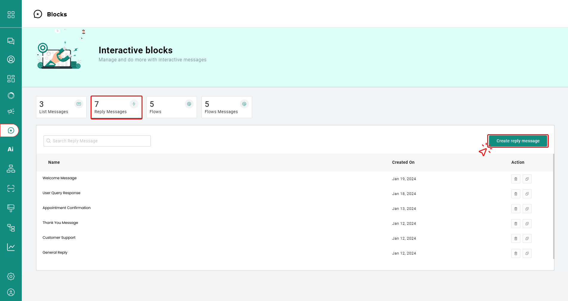 * Visit the '**Blocks**' page on the dashboard, click '**Reply Messages'** and tap '**Create Reply Messages'**.