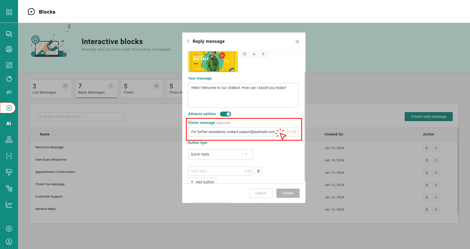 5. **Advanced Options (Footer Message):**