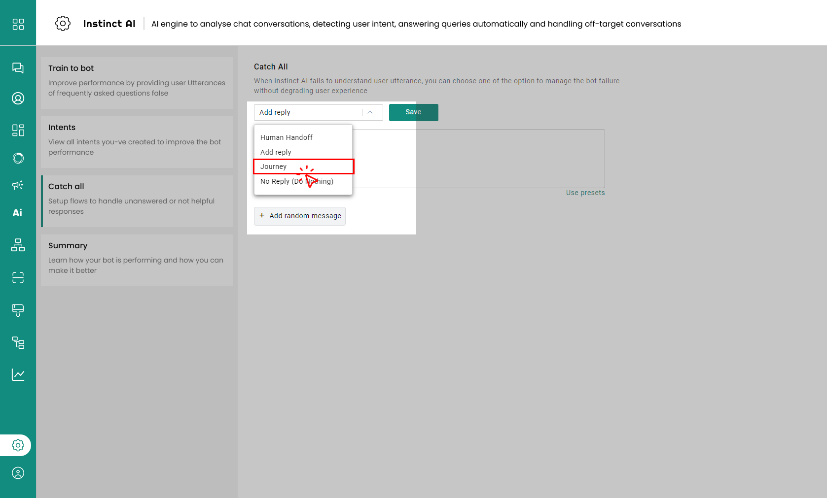 Let's say you're in automobiles; whenever the Instinct AI fails to understand the user intent, you might want the system to respond with a regular message that showcases your services.