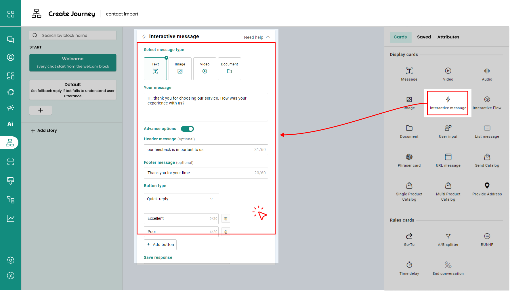 Interactive message card allows you to send a message with one or more buttons. The buttons can be of three types: quick reply, URL, or phone number. You can use an interactive message card to solicit a response from the customer, such as a rating, a feedback, a choice, or an action.