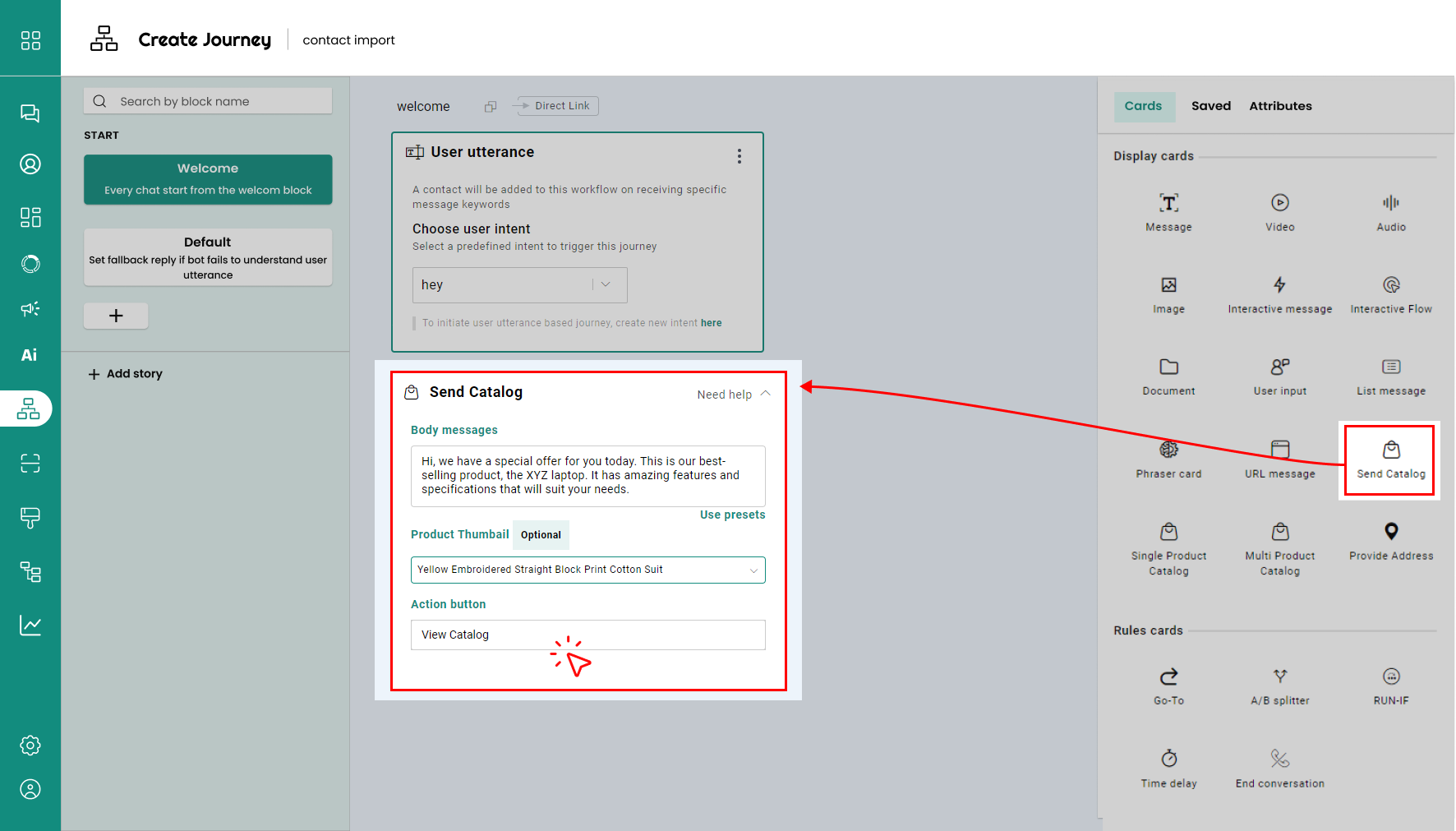 Any business indulged in selling products or services can utilize this. For example, an online store business owner can create a journey using the catalog card that has all their products. Whenever a customers sends a message like 'I am here to buy' or performs a particular action, the catalog card is sent with a message like: