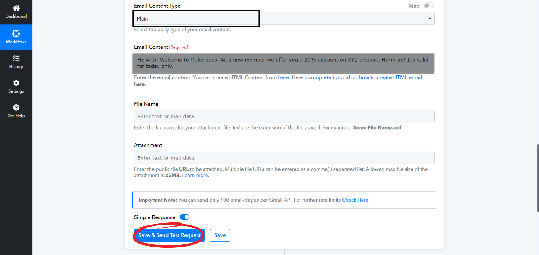 5. You'll receive a list of fields. If you want to update the data, tap '**save and test response**' or else tap '**save**' to store the response.
