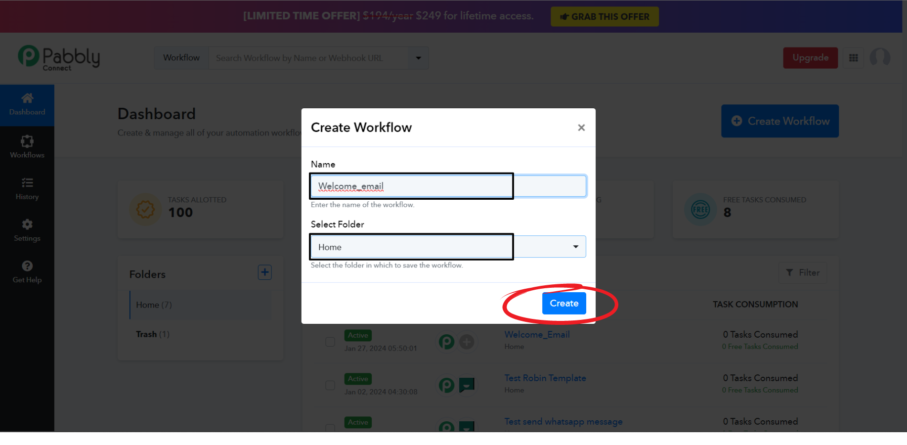 2. Enter a relevant **workflow name** and **select** **where** you want **to** **store** **it** and tap '**Create**.'&#x20;