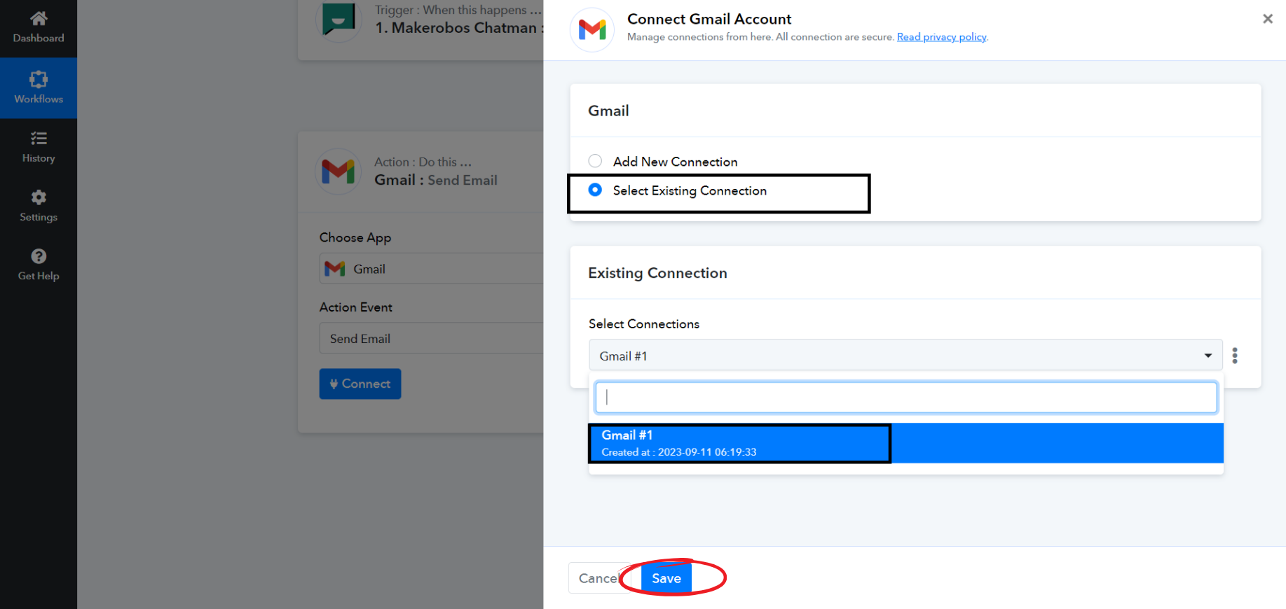 We have an existing connection, so we opt for 'select existing connection' and then under '**existing connection**,' select connection and tap '**Save**.'