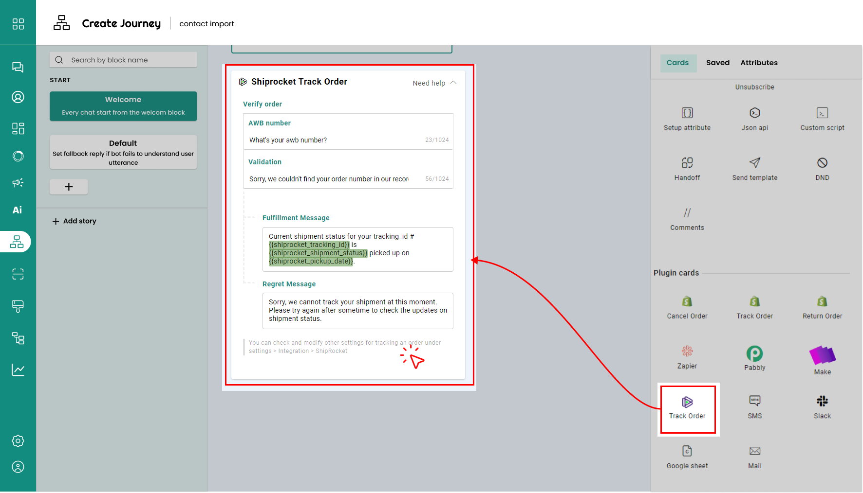 Shiprocket Track Order card allows you to track a shipment from Shiprocket courier service and send a status update message to the customer. You can configure the tracking number, the courier name, and the message template.&#x20;