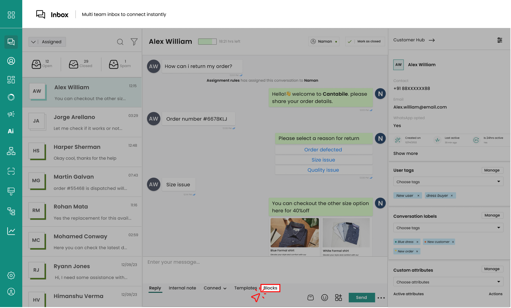 **Blocks messages** are messages that contain **interactive elements**, such as **buttons** or **lists**, that users can select to reply. They are helpful in several cases: