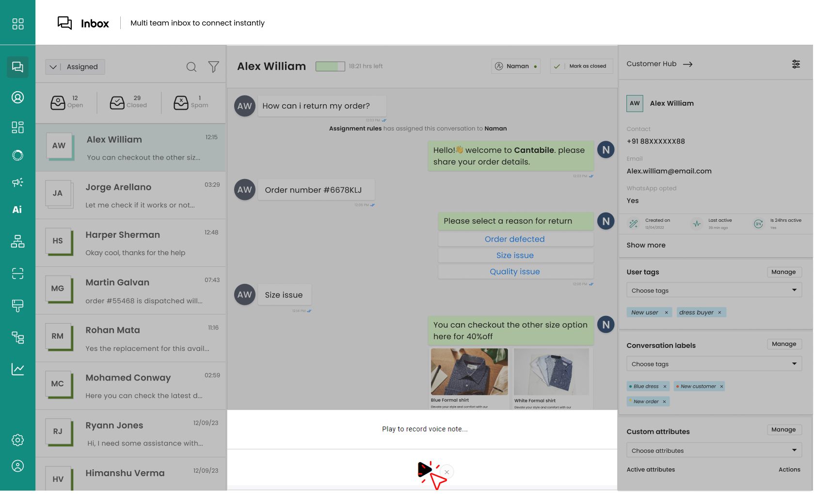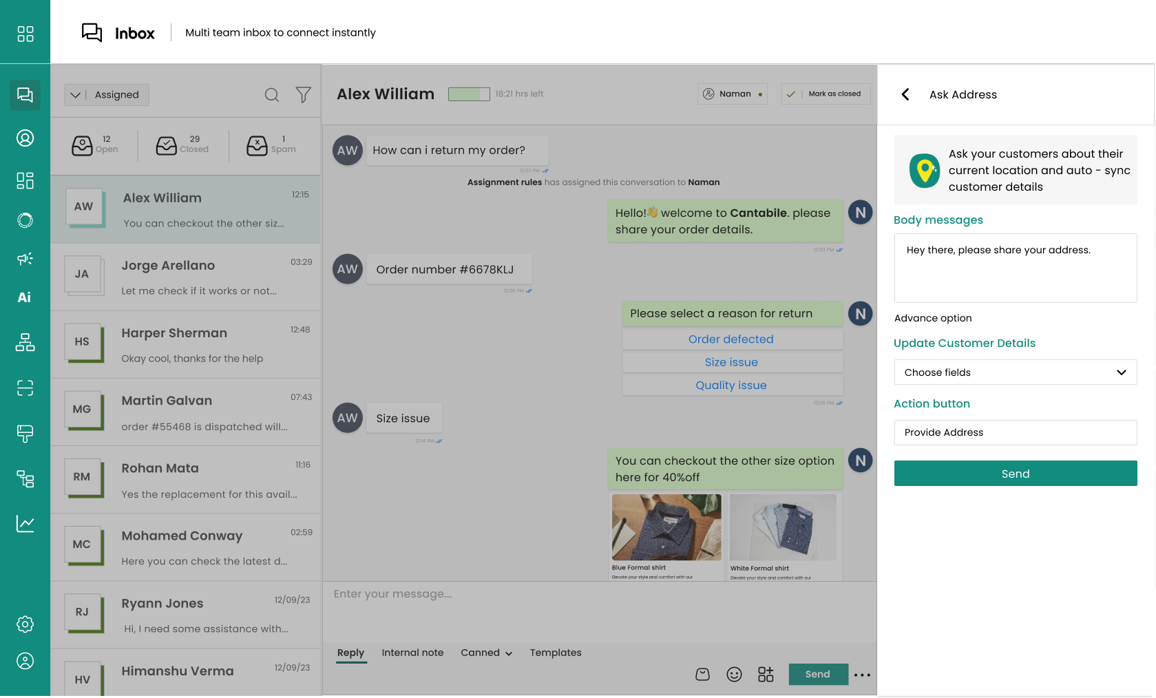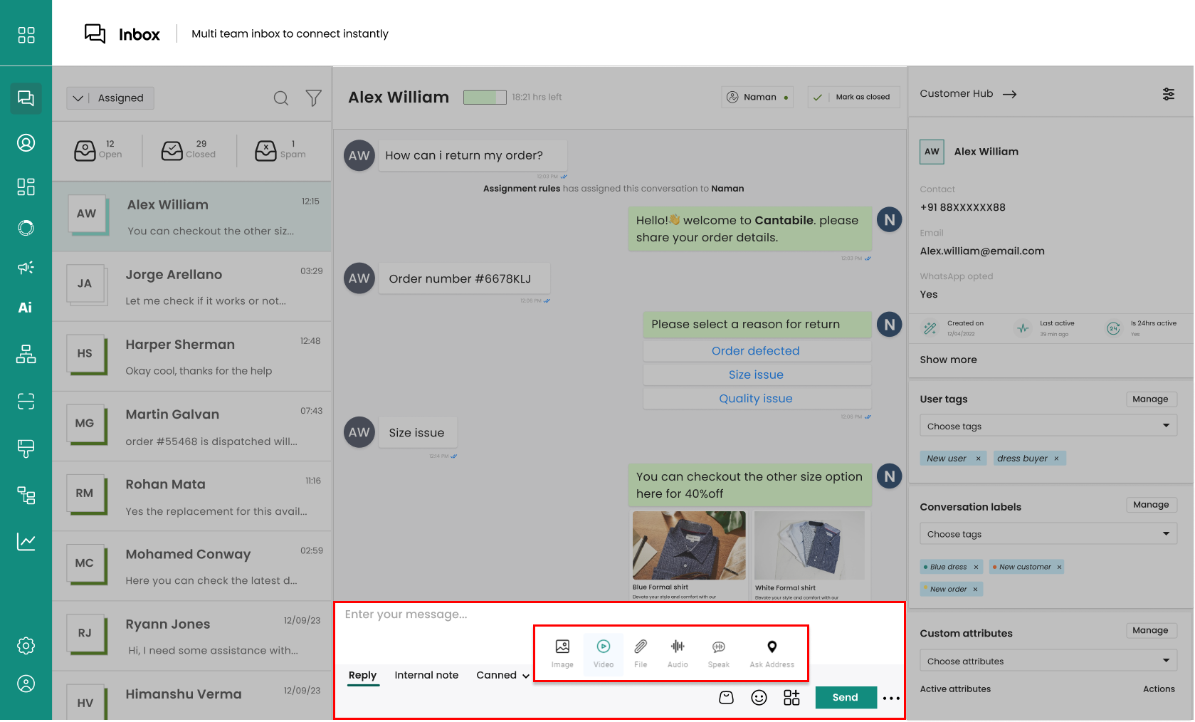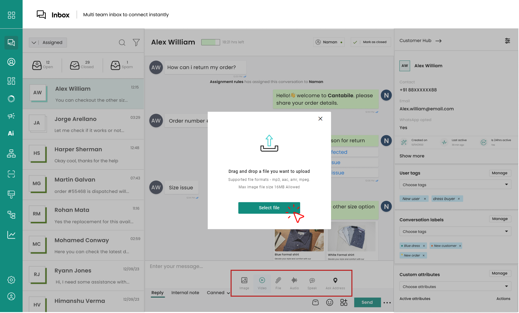 Click on the icon shown below to open a pop-up with options to send **images**, **videos**, **files**, **audio**, **speak (audio message)**, and **ask** **for an** **address**.
