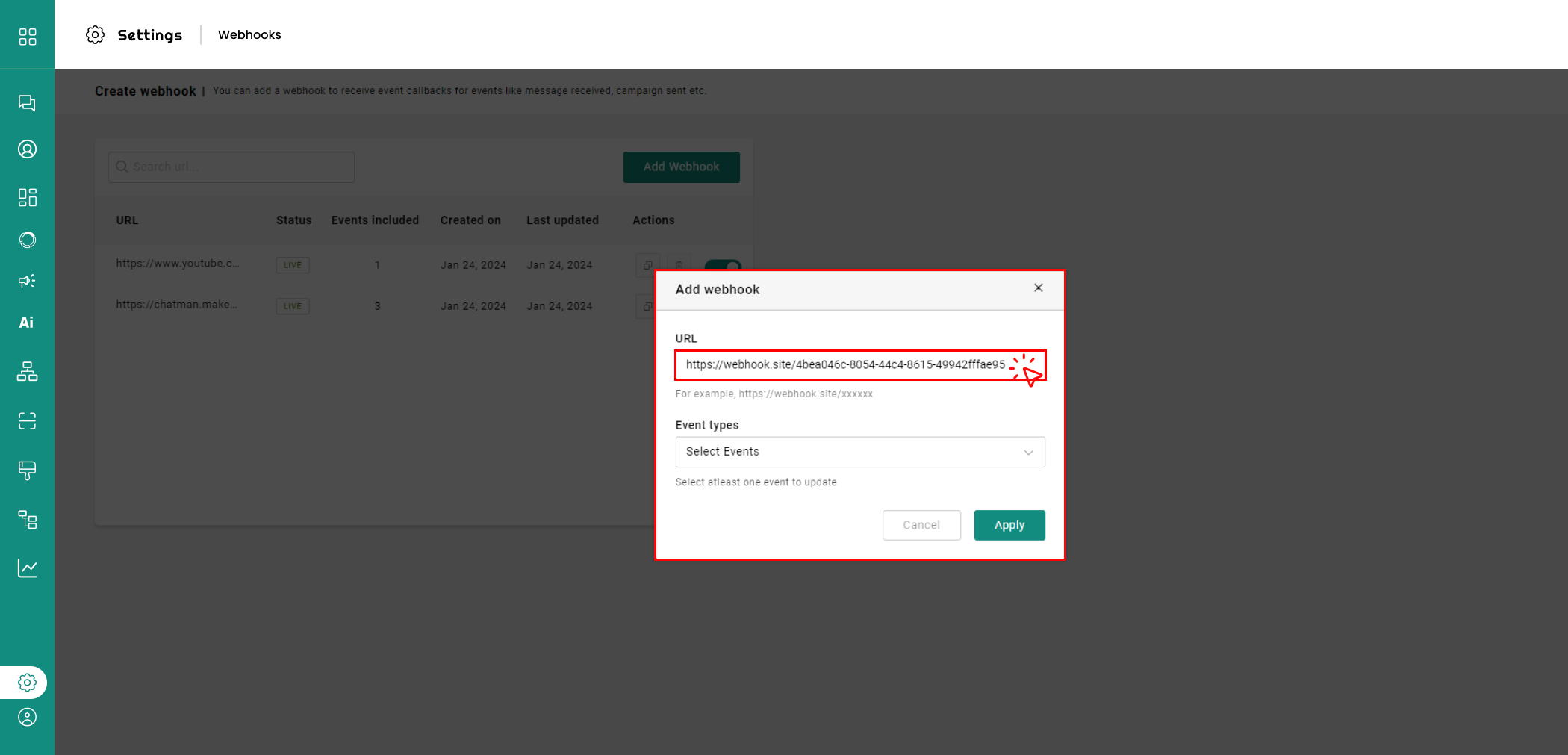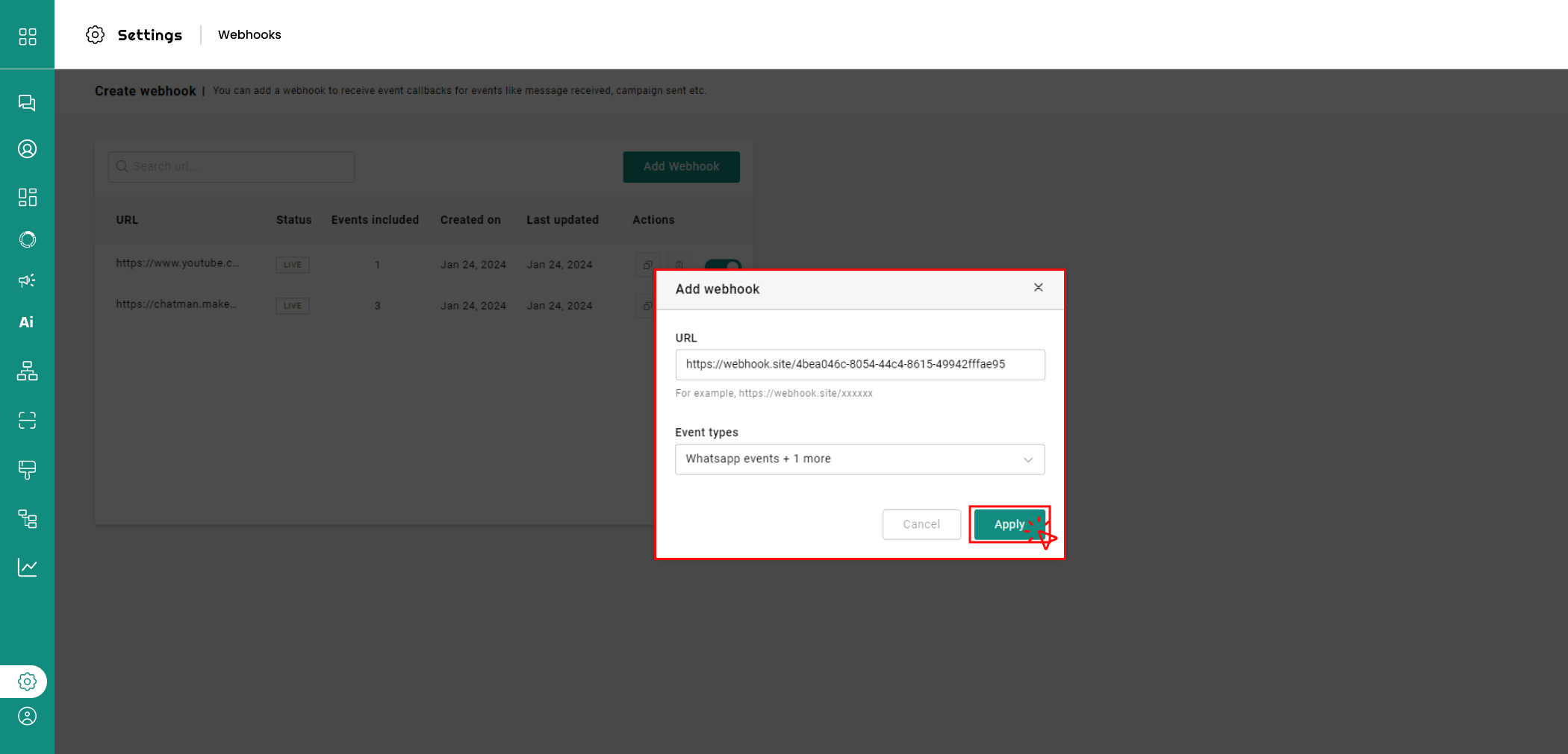 3. Tap 'Apply' to add the webhook. It will be visible in the webhook page.